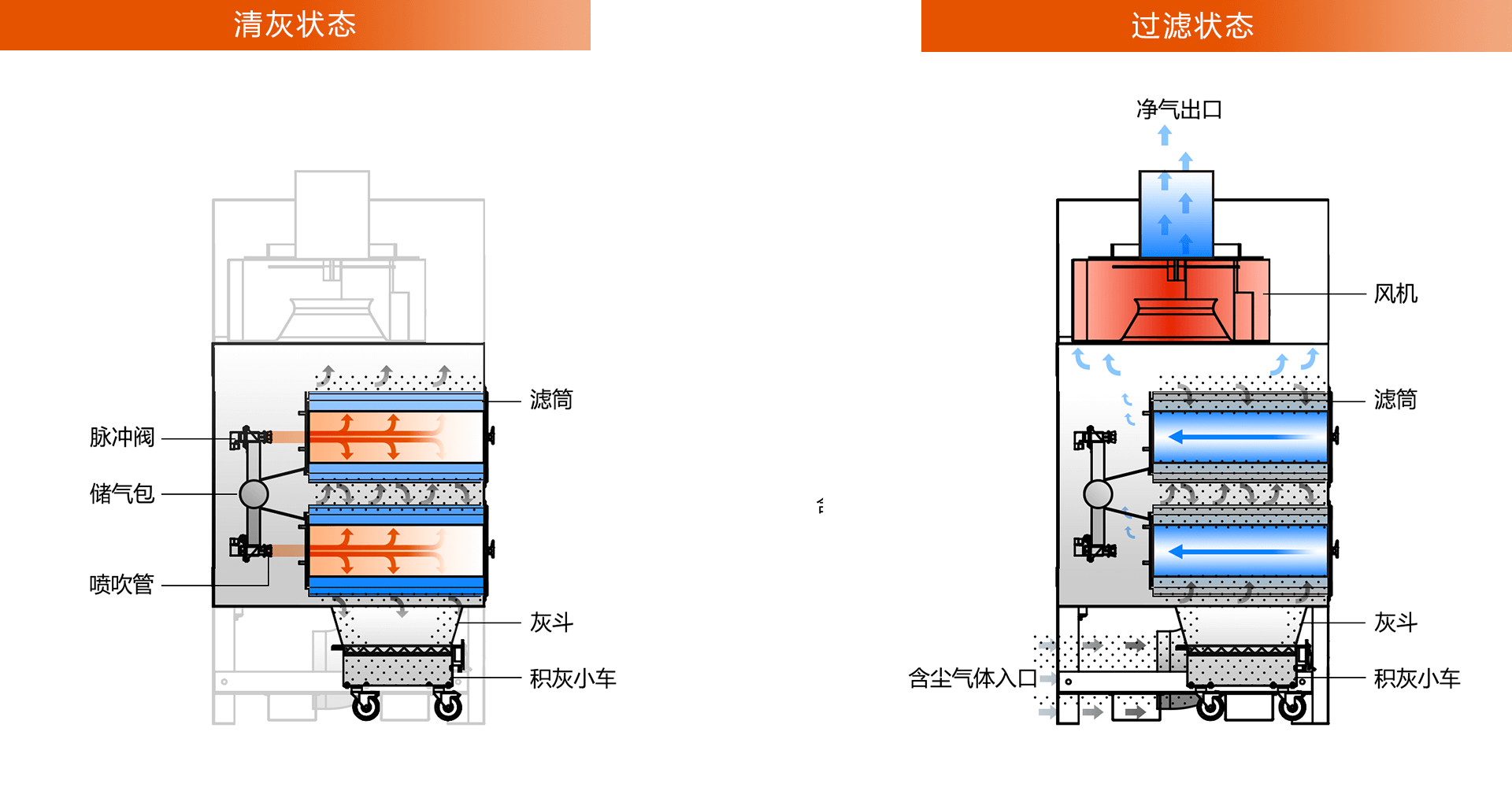 通過反復小幅度的沖擊振動,將積聚在濾筒外部的粉塵震落至灰斗內。